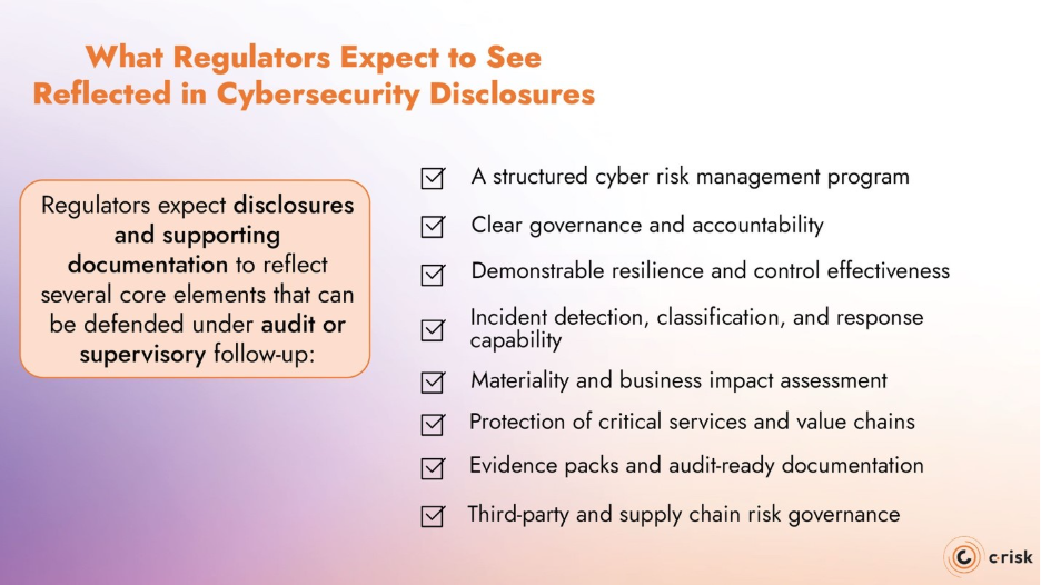First, organizations must disclose significant or material cyber incidents within legally defined deadlines. Second, they must demonstrate that cybersecurity risk is governed as an enterprise risk, with clear oversight, control effectiveness, and resilience practices.