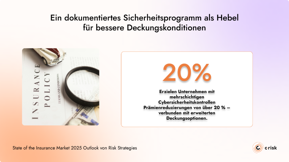 Bei großen Unternehmen, deren Prämien in den Millionenbereich gehen, hat eine objektive Analyse des Cyber-Risikoprofils einen unmittelbaren finanziellen Gegenwert. Nachweise zur Kontrollleistung, dokumentierte Incident-Response-Tests, Metriken aus dem Schwachstellenmanagement sowie quantifiziertes Verlustexposure können allesamt zu verbesserten Deckungskonditionen beitragen. Laut dem State of the Insurance Market 2025 Outlook von Risk Strategies erzielen Unternehmen mit mehrschichtigen Cybersicherheitskontrollen Prämienreduzierungen von über 20 % – verbunden mit erweiterten Deckungsoptionen.