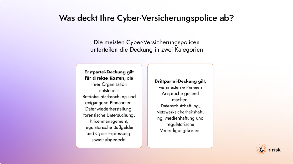 Erstpartei-Deckung gilt für direkte Kosten, die Ihrer Organisation entstehen: Betriebsunterbrechung und entgangene Einnahmen, Datenwiederherstellung, forensische Untersuchung, Krisenmanagement, regulatorische Bußgelder und Cyber-Erpressung, soweit abgedeckt.