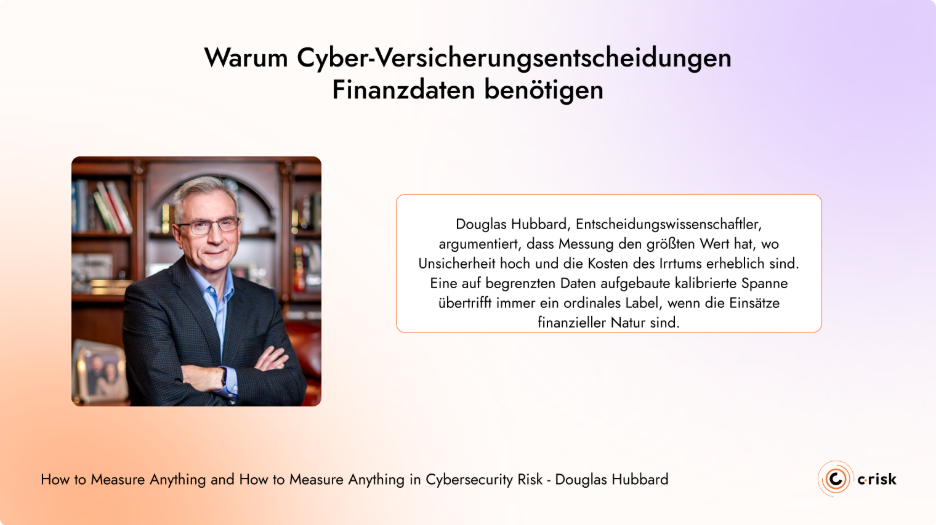 Douglas Hubbard, Entscheidungswissenschaftler und Autor von How to Measure Anything und How to Measure Anything in Cybersecurity Risk, argumentiert, dass Messung den größten Wert hat, wo Unsicherheit hoch und die Kosten des Irrtums erheblich sind. Eine auf begrenzten Daten aufgebaute kalibrierte Spanne übertrifft immer ein ordinales Label, wenn die Einsätze finanzieller Natur sind.