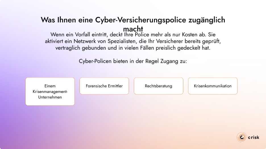 Cyber-Versicherung dient zwei Zwecken: Sie überträgt die finanziellen Kosten eines Vorfalls, der Ihre Risikobereitschaft übersteigt, und verschafft Ihnen Zugang zu einem vorab geprüften Netzwerk von Krisenmanagement-Spezialisten, forensischen Ermittlern, Rechtsberatern und Kommunikationsunternehmen. Dieser Expertenzugang stellt sicher, dass Ihr Reaktionsplan wirksam ist, wenn Ihr Unternehmen bedroht wird.