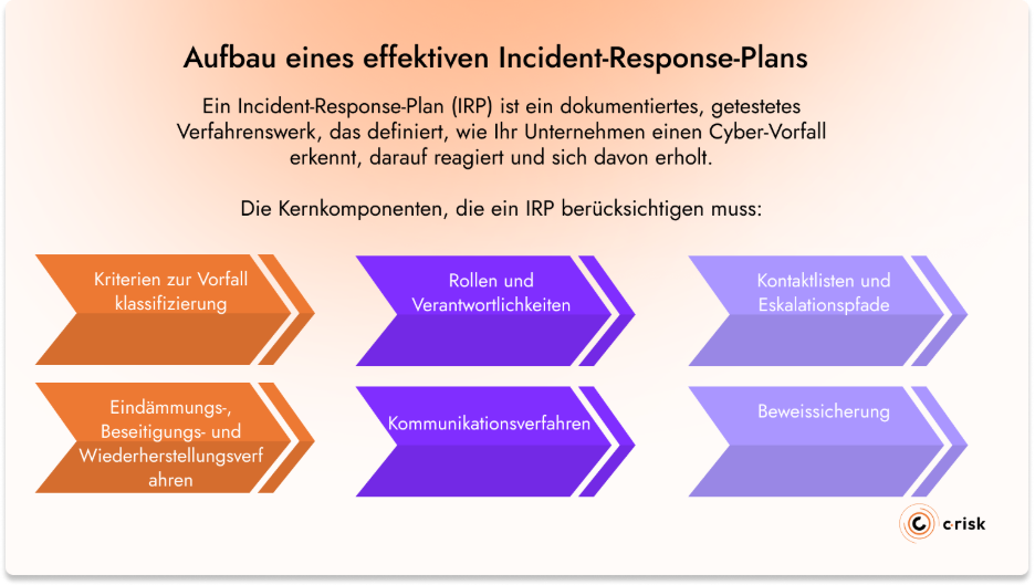 Ein Incident-Response-Plan (IRP) ist ein dokumentiertes, getestetes Verfahrenswerk, das definiert, wie Ihr Unternehmen einen Cyber-Vorfall erkennt, darauf reagiert und sich davon erholt. Es ist ein Schritt-für-Schritt-Handbuch, was zu tun ist und wer was tut – ab dem Moment, in dem ein Vorfall erklärt wird.