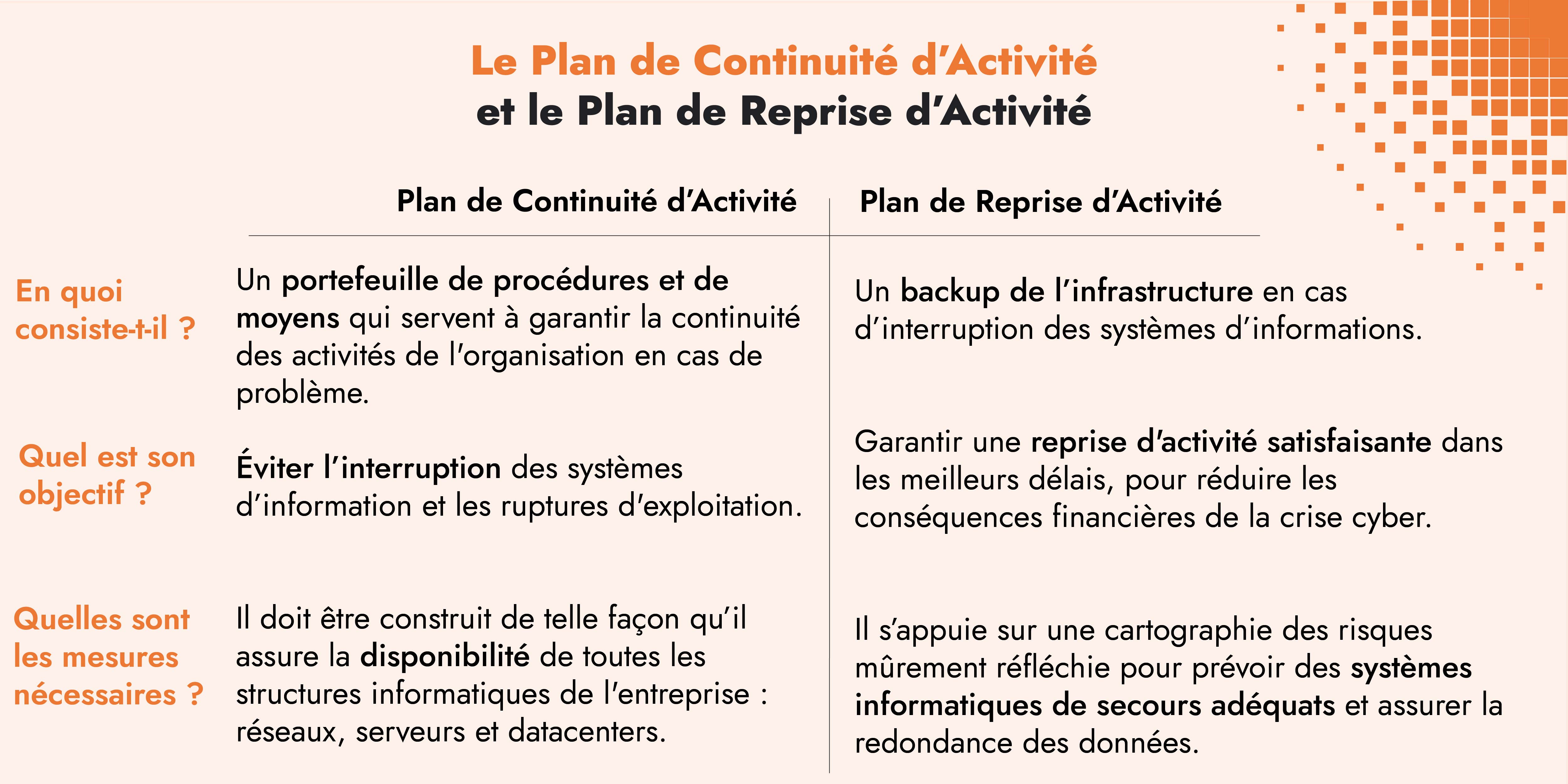 - Le Plan de Reprise d’Activité précise quel système de sauvegarde enclencher pour garantir la sécurité des données confidentielles ;